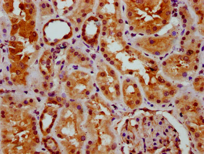 IHC image of CSB-PA009996LA01HU diluted at 1:400 and staining in paraffin-embedded human kidney tissue performed on a Leica BondTM system. After dewaxing and hydration, antigen retrieval was mediated by high pressure in a citrate buffer (pH 6.0). Section was blocked with 10% normal goat serum 30min at RT. Then primary antibody (1% BSA) was incubated at 4°C overnight. The primary is detected by a biotinylated secondary antibody and visualized using an HRP conjugated SP system.