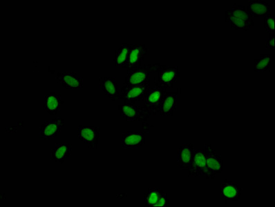 • Immunofluorescent analysis of Hela cells using CSB-PA010087PA107nme1HU at dilution of 1:100 and Alexa Fluor 488-congugated AffiniPure Goat Anti-Rabbit IgG(H+L)