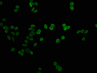 Immunofluorescence staining of HepG2 cells with CSB-PA010087OA101nme1HU at 1:1, counter-stained with DAPI. The cells were fixed in 4% formaldehyde, permeabilized using 0.2% Triton X-100 and blocked in 10% normal Goat Serum. The cells were then incubated with the antibody overnight at 4°C. The secondary antibody was Alexa Fluor 488-congugated AffiniPure Goat Anti-Rabbit IgG(H+L).