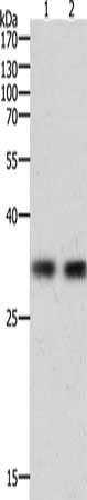 • Gel: 10%SDS-PAGE, Lysate: 40 μg, Lane 1-2: k562 cells, Hela cells, Primary antibody: CSB-PA913997(HAVCR1 Antibody) at dilution 1/700, Secondary antibody: Goat anti rabbit IgG at 1/8000 dilution, Exposure time: 90 seconds