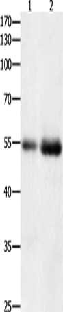 • Gel: 10%SDS-PAGE, Lysate: 40 μg, Lane 1-2: Human colon tissue, Human kidney cancer tissue, Primary antibody: CSB-PA278920(HDAC1 Antibody) at dilution 1/400, Secondary antibody: Goat anti rabbit IgG at 1/8000 dilution, Exposure time: 2 minutes