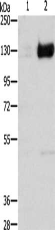 • Gel: 8%SDS-PAGE, Lysate: 40 μg, Lane 1-2: 293T cells untreated with cobalt chloride, 293T cells treated with cobalt chloride (0.1 mM for 4 hours), Primary antibody: CSB-PA578243(HIF1A Antibody) at dilution 1/750, Secondary antibody: Goat anti rabbit IgG at 1/8000 dilution, Exposure time: 2 minutes