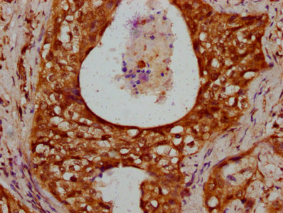 IHC image of CSB-PA010378OA80nhibHU diluted at 1:10 and staining in paraffin-embedded human cervical cancer performed on a Leica BondTM system. After dewaxing and hydration, antigen retrieval was mediated by high pressure in a citrate buffer (pH 6.0). Section was blocked with 10% normal goat serum 30min at RT. Then primary antibody (1% BSA) was incubated at 4°C overnight. The primary is detected by a biotinylated secondary antibody and visualized using an HRP conjugated SP system.