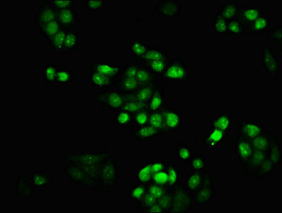 Immunofluorescence staining of PC-3 cells with CSB-PA010378OA80nhibHU at 1:1, counter-stained with DAPI. The cells were fixed in 4% formaldehyde, permeabilized using 0.2% Triton X-100 and blocked in 10% normal Goat Serum. The cells were then incubated with the antibody overnight at 4°C. The secondary antibody was Alexa Fluor 488-congugated AffiniPure Goat Anti-Rabbit IgG(H+L).