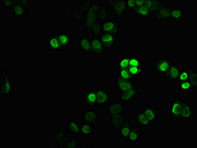 Immunofluorescence staining of PC-3 cells with CSB-PA010378OA45nme1HU at 1:12.5, counter-stained with DAPI. The cells were fixed in 4% formaldehyde, permeabilized using 0.2% Triton X-100 and blocked in 10% normal Goat Serum. The cells were then incubated with the antibody overnight at 4°C. The secondary antibody was Alexa Fluor 488-congugated AffiniPure Goat Anti-Rabbit IgG(H+L).
