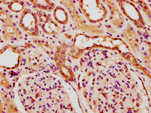IHC image of CSB-PA010378PA84nforHU diluted at 1:20 and staining in paraffin-embedded human kidney tissue performed on a Leica BondTM system. After dewaxing and hydration, antigen retrieval was mediated by high pressure in a citrate buffer (pH 6.0). Section was blocked with 10% normal goat serum 30min at RT. Then primary antibody (1% BSA) was incubated at 4°C overnight. The primary is detected by a biotinylated secondary antibody and visualized using an HRP conjugated SP system.