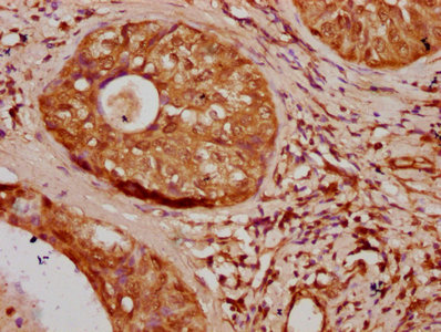 • IHC image of CSB-PA010379OA106nbhbHU diluted at 1:20 and staining in paraffin-embedded human cervical cancer performed on a Leica BondTM system. After dewaxing and hydration, antigen retrieval was mediated by high pressure in a citrate buffer (pH 6.0). Section was blocked with 10% normal goat serum 30min at RT. Then primary antibody (1% BSA) was incubated at 4°C overnight. The primary is detected by a biotinylated secondary antibody and visualized using an HRP conjugated SP system.