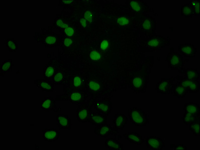 • Immunofluorescence staining of Hela cells with CSB-PA010389OA11nme2HU at 1:1, counter-stained with DAPI. The cells were fixed in 4% formaldehyde, permeabilized using 0.2% Triton X-100 and blocked in 10% normal Goat Serum. The cells were then incubated with the antibody overnight at 4°C. The secondary antibody was Alexa Fluor 488-congugated AffiniPure Goat Anti-Rabbit IgG(H+L).