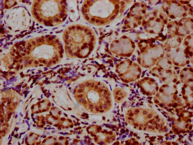 • IHC image of CSB-PA010389OA118nbhbHU diluted at 1:20 and staining in paraffin-embedded human pancreatic tissue performed on a Leica BondTM system. After dewaxing and hydration, antigen retrieval was mediated by high pressure in a citrate buffer (pH 6.0). Section was blocked with 10% normal goat serum 30min at RT. Then primary antibody (1% BSA) was incubated at 4°C overnight. The primary is detected by a biotinylated secondary antibody and visualized using an HRP conjugated SP system.