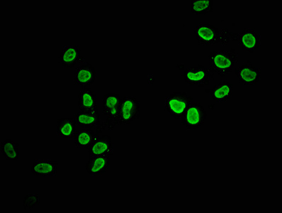 Immunofluorescence staining of Hela cells with CSB-PA010389PA36nacHU at 1:62, counter-stained with DAPI. The cells were fixed in 4% formaldehyde, permeabilized using 0.2% Triton X-100 and blocked in 10% normal Goat Serum. The cells were then incubated with the antibody overnight at 4°C. The secondary antibody was Alexa Fluor 488-congugated AffiniPure Goat Anti-Rabbit IgG(H+L).