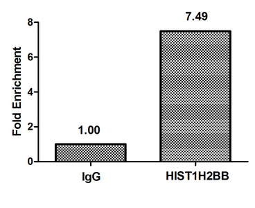 • Chromatin Immunoprecipitation Hela (4*106) were treated with Micrococcal Nuclease, sonicated, and immunoprecipitated with 8µg anti-HIST1H2BB (CSB-PA010402OA16nacHU) or a control normal rabbit IgG. The resulting ChIP DNA was quantified using real-time PCR with primers against the β-Globin promoter.
