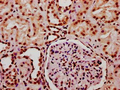 • IHC image of CSB-PA010403OA11nacHU diluted at 1:20 and staining in paraffin-embedded human kidney tissue performed on a Leica BondTM system. After dewaxing and hydration, antigen retrieval was mediated by high pressure in a citrate buffer (pH 6.0). Section was blocked with 10% normal goat serum 30min at RT. Then primary antibody (1% BSA) was incubated at 4°C overnight. The primary is detected by a biotinylated secondary antibody and visualized using an HRP conjugated SP system.