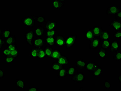 • Immunofluorescence staining of Hela cells with CSB-PA010403OA12nacHU at 1:3, counter-stained with DAPI. The cells were fixed in 4% formaldehyde, permeabilized using 0.2% Triton X-100 and blocked in 10% normal Goat Serum. The cells were then incubated with the antibody overnight at 4°C. The secondary antibody was Alexa Fluor 488-congugated AffiniPure Goat Anti-Rabbit IgG(H+L).