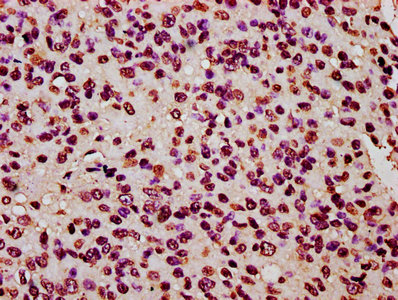 IHC image of CSB-PA010403OA120nhibHU diluted at 1:20 and staining in paraffin-embedded human glioma performed on a Leica BondTM system. After dewaxing and hydration, antigen retrieval was mediated by high pressure in a citrate buffer (pH 6.0). Section was blocked with 10% normal goat serum 30min at RT. Then primary antibody (1% BSA) was incubated at 4°C overnight. The primary is detected by a biotinylated secondary antibody and visualized using an HRP conjugated SP system.