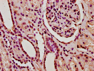 IHC image of CSB-PA010403OA120nhibHU diluted at 1:20 and staining in paraffin-embedded human kidney tissue performed on a Leica BondTM system. After dewaxing and hydration, antigen retrieval was mediated by high pressure in a citrate buffer (pH 6.0). Section was blocked with 10% normal goat serum 30min at RT. Then primary antibody (1% BSA) was incubated at 4°C overnight. The primary is detected by a biotinylated secondary antibody and visualized using an HRP conjugated SP system.