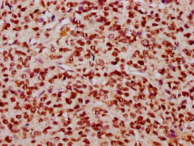 IHC image of CSB-PA010403OA23nhibHU diluted at 1:10 and staining in paraffin-embedded human glioma performed on a Leica BondTM system. After dewaxing and hydration, antigen retrieval was mediated by high pressure in a citrate buffer (pH 6.0). Section was blocked with 10% normal goat serum 30min at RT. Then primary antibody (1% BSA) was incubated at 4°C overnight. The primary is detected by a biotinylated secondary antibody and visualized using an HRP conjugated SP system.