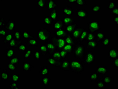 • Immunofluorescence staining of Hela cells with CSB-PA010403OA34nsucHU at 1:1, counter-stained with DAPI. The cells were fixed in 4% formaldehyde, permeabilized using 0.2% Triton X-100 and blocked in 10% normal Goat Serum. The cells were then incubated with the antibody overnight at 4°C. The secondary antibody was Alexa Fluor 488-congugated AffiniPure Goat Anti-Rabbit IgG(H+L).