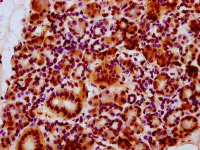 • IHC image of CSB-PA010403OA34nsucHU diluted at 1:10 and staining in paraffin-embedded human kidney tissue performed on a Leica BondTM system. After dewaxing and hydration, antigen retrieval was mediated by high pressure in a citrate buffer (pH 6.0). Section was blocked with 10% normal goat serum 30min at RT. Then primary antibody (1% BSA) was incubated at 4°C overnight. The primary is detected by a biotinylated secondary antibody and visualized using an HRP conjugated SP system.