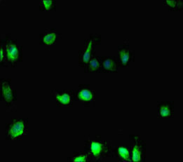 Immunofluorescent analysis of Hela cells using CSB-PA010404LA01HU at dilution of 1: 100 and Alexa Fluor 488-congugated AffiniPure Goat Anti-Rabbit IgG(H+L)