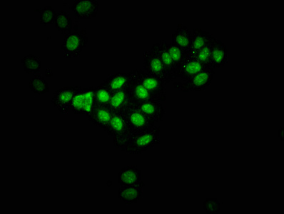 Immunofluorescence staining of HepG2 cells with CSB-PA010418OA122nbhbHU at 1:2.5, counter-stained with DAPI. The cells were fixed in 4% formaldehyde, permeabilized using 0.2% Triton X-100 and blocked in 10% normal Goat Serum. The cells were then incubated with the antibody overnight at 4°C. The secondary antibody was Alexa Fluor 488-congugated AffiniPure Goat Anti-Rabbit IgG(H+L).