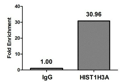 Chromatin Immunoprecipitation Hela (4*106) were treated with Micrococcal Nuclease, sonicated, and immunoprecipitated with 8µg anti-HIST1H3A (CSB-PA010418OA14nacHU) or a control normal rabbit IgG. The resulting ChIP DNA was quantified using real-time PCR with primers against the β-Globin promoter.