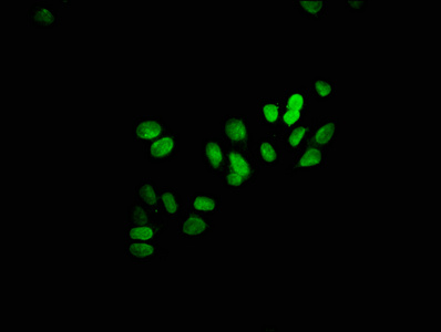 Immunofluorescence staining of HepG2 cells with CSB-PA010418OA23npropHU at 1:25, counter-stained with DAPI. The cells were fixed in 4% formaldehyde, permeabilized using 0.2% Triton X-100 and blocked in 10% normal Goat Serum. The cells were then incubated with the antibody overnight at 4°C. The secondary antibody was Alexa Fluor 488-congugated AffiniPure Goat Anti-Rabbit IgG(H+L).