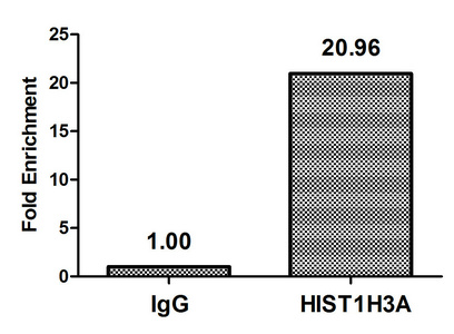 Chromatin Immunoprecipitation Hela (4*106) were treated with Micrococcal Nuclease, sonicated, and immunoprecipitated with 5µg anti-HIST1H3A (CSB-PA010418PA09nacHU) or a control normal rabbit IgG. The resulting ChIP DNA was quantified using real-time PCR with primers against the β-Globin promoter.