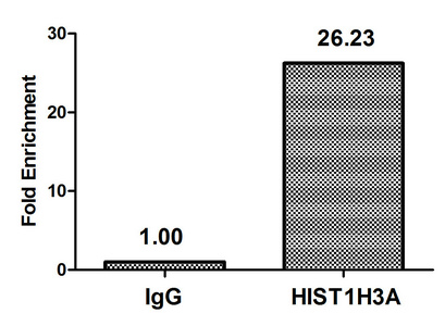 Chromatin Immunoprecipitation Hela (4*106) were treated with Micrococcal Nuclease, sonicated, and immunoprecipitated with 5µg anti-HIST1H3A (CSB-PA010418OA10nogHU) or a control normal rabbit IgG. The resulting ChIP DNA was quantified using real-time PCR with primers against the β-Globin promoter.