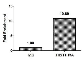 Chromatin Immunoprecipitation Hela (4*106) were treated with Micrococcal Nuclease, sonicated, and immunoprecipitated with 8µg anti-HIST1H3A (CSB-PA010418PA09nme3HU) or a control normal rabbit IgG. The resulting ChIP DNA was quantified using real-time PCR with primers against the β-Globin promoter.