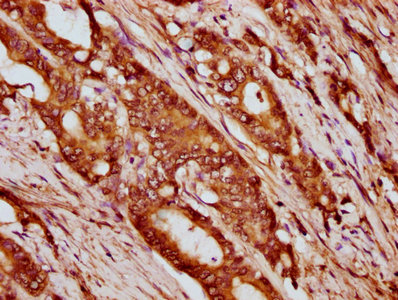 IHC image of CSB-PA010429OA12nbhbHU diluted at 1:20 and staining in paraffin-embedded human colon cancer performed on a Leica BondTM system. After dewaxing and hydration, antigen retrieval was mediated by high pressure in a citrate buffer (pH 6.0). Section was blocked with 10% normal goat serum 30min at RT. Then primary antibody (1% BSA) was incubated at 4°C overnight. The primary is detected by a biotinylated secondary antibody and visualized using an HRP conjugated SP system.