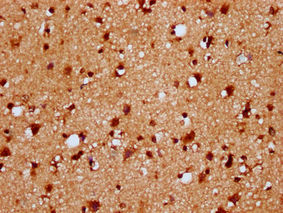 IHC image of CSB-PA010429OA12nbhbHU diluted at 1:20 and staining in paraffin-embedded human brain tissue performed on a Leica BondTM system. After dewaxing and hydration, antigen retrieval was mediated by high pressure in a citrate buffer (pH 6.0). Section was blocked with 10% normal goat serum 30min at RT. Then primary antibody (1% BSA) was incubated at 4°C overnight. The primary is detected by a biotinylated secondary antibody and visualized using an HRP conjugated SP system.