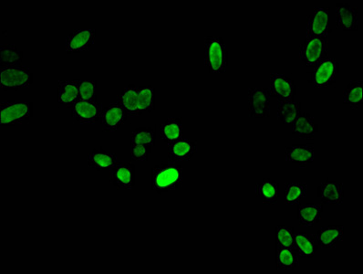 Immunofluorescent analysis of Hela cells using CSB-PA010429PA03nme1HU at dilution of 1:100 and Alexa Fluor 488-congugated AffiniPure Goat Anti-Rabbit IgG(H+L)