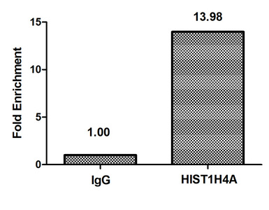 Chromatin Immunoprecipitation Hela (4*106) were treated with Micrococcal Nuclease, sonicated, and immunoprecipitated with 8µg anti-HIST1H4A (CSB-PA010429OA03nme1HU) or a control normal rabbit IgG. The resulting ChIP DNA was quantified using real-time PCR with primers against the β-Globin promoter.