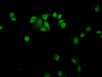 Immunofluorescence staining of Hela cells with CSB-PA010429OA35nme1HU at 1:12.5, counter-stained with DAPI. The cells were fixed in 4% formaldehyde, permeabilized using 0.2% Triton X-100 and blocked in 10% normal Goat Serum. The cells were then incubated with the antibody overnight at 4°C. The secondary antibody was Alexa Fluor 488-congugated AffiniPure Goat Anti-Rabbit IgG(H+L).