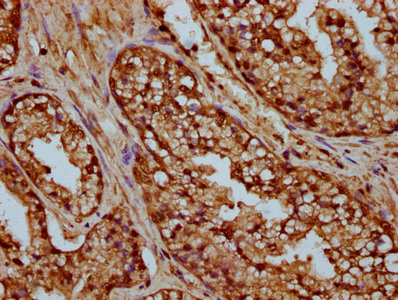 IHC image of CSB-PA010429OA35nme1HU diluted at 1:25 and staining in paraffin-embedded human prostate cancer performed on a Leica BondTM system. After dewaxing and hydration, antigen retrieval was mediated by high pressure in a citrate buffer (pH 6.0). Section was blocked with 10% normal goat serum 30min at RT. Then primary antibody (1% BSA) was incubated at 4°C overnight. The primary is detected by a biotinylated secondary antibody and visualized using an HRP conjugated SP system.