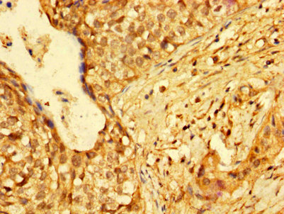 IHC image of CSB-PA010561LA01HU diluted at 1:300 and staining in paraffin-embedded human cervical cancer performed on a Leica BondTM system. After dewaxing and hydration, antigen retrieval was mediated by high pressure in a citrate buffer (pH 6.0). Section was blocked with 10% normal goat serum 30min at RT. Then primary antibody (1% BSA) was incubated at 4°C overnight. The primary is detected by a biotinylated secondary antibody and visualized using an HRP conjugated SP system.