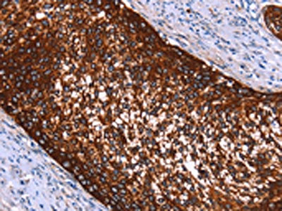 The image on the left is immunohistochemistry of paraffin-embedded Human cervical cancer tissue using CSB-PA045049(HMGCS2 Antibody) at dilution 1/40, on the right is treated with synthetic peptide. (Original magnification: ×200)