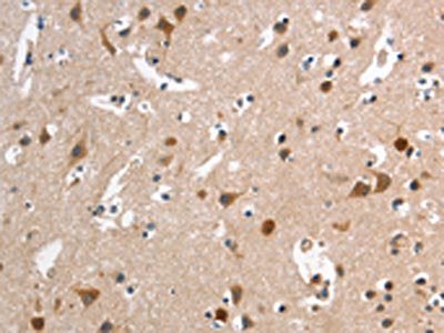 The image on the left is immunohistochemistry of paraffin-embedded Human brain tissue using CSB-PA162889(HMMR Antibody) at dilution 1/40, on the right is treated with synthetic peptide. (Original magnification: ×200)