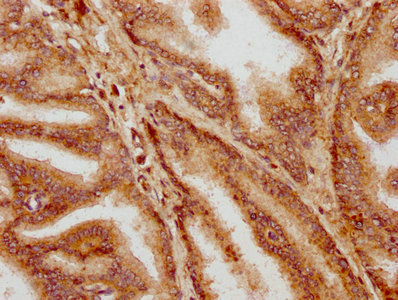 IHC image of CSB-PA010685LA01HU diluted at 1:400 and staining in paraffin-embedded human prostate tissue performed on a Leica BondTM system. After dewaxing and hydration, antigen retrieval was mediated by high pressure in a citrate buffer (pH 6.0). Section was blocked with 10% normal goat serum 30min at RT. Then primary antibody (1% BSA) was incubated at 4°C overnight. The primary is detected by a biotinylated secondary antibody and visualized using an HRP conjugated SP system.