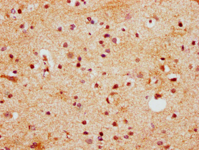 IHC image of CSB-PA010685LA01HU diluted at 1:400 and staining in paraffin-embedded human brain tissue performed on a Leica BondTM system. After dewaxing and hydration, antigen retrieval was mediated by high pressure in a citrate buffer (pH 6.0). Section was blocked with 10% normal goat serum 30min at RT. Then primary antibody (1% BSA) was incubated at 4°C overnight. The primary is detected by a biotinylated secondary antibody and visualized using an HRP conjugated SP system.