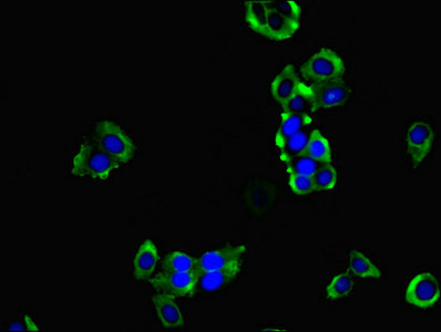 Immunofluorescent analysis of PC-3 cells using CSB-PA02269A0Rb at dilution of 1:100 and Alexa Fluor 488-congugated AffiniPure Goat Anti-Rabbit IgG(H+L)
