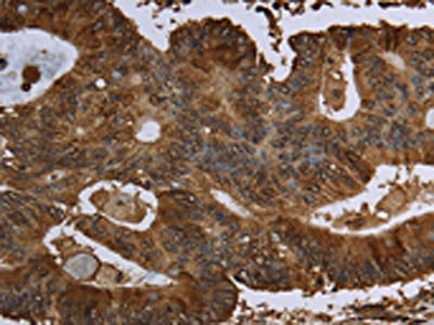 The image on the left is immunohistochemistry of paraffin-embedded Human colon cancer tissue using CSB-PA994843(HPGD Antibody) at dilution 1/30, on the right is treated with fusion protein. (Original magnification: ×200)