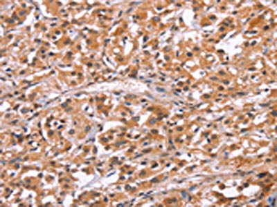 The image on the left is immunohistochemistry of paraffin-embedded Human gastic cancer tissue using CSB-PA297560(HRK Antibody) at dilution 1/20, on the right is treated with synthetic peptide. (Original magnification: ×200)