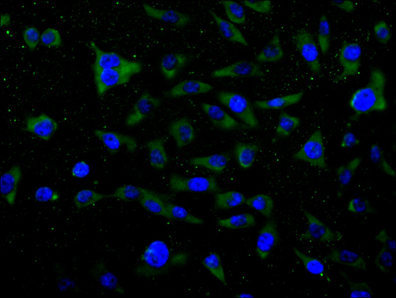 Immunofluorescence staining of MCF-7 cell with CSB-PA010756LA01HU at 1:30, counter-stained with DAPI. The cells were fixed in 4% formaldehyde and blocked in 10% normal Goat Serum. The cells were then incubated with the antibody overnight at 4C. The secondary antibody was Alexa Fluor 488-congugated AffiniPure Goat Anti-Rabbit IgG(H+L).