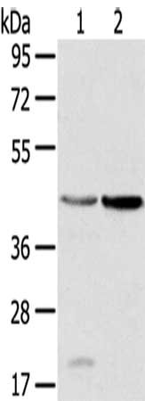 Gel: 8%SDS-PAGE,Lysate: 40 μg,Lane 1-2: Human placenta tissue, Human normal kidney tissue,Primary antibody: CSB-PA080468(HSD11B2 Antibody) at dilution 1/200 dilution,Secondary antibody: Goat anti rabbit IgG at 1/8000 dilution,Exposure time: 30 seconds