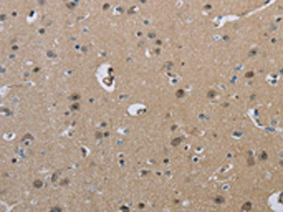 • The image on the left is immunohistochemistry of paraffin-embedded Human brain tissue using CSB-PA153980(HSD3B1 Antibody) at dilution 1/40, on the right is treated with fusion protein. (Original magnification: ×200)