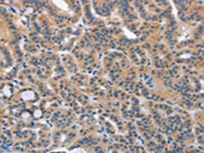 • The image on the left is immunohistochemistry of paraffin-embedded Human thyroid cancer tissue using CSB-PA153980(HSD3B1 Antibody) at dilution 1/40, on the right is treated with fusion protein. (Original magnification: ×200)