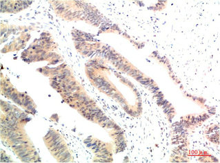 • Immunohistochemical analysis of paraffin-embedded Human Colon Carcinoma Tissue using HSP90α Rabbit pAb diluted at 1:200
