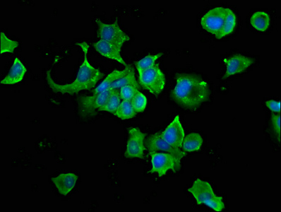 Immunofluorescence staining of MCF-7 cells with CSB-PA00109A0Rb at 1:66, counter-stained with DAPI. The cells were fixed in 4% formaldehyde, permeabilized using 0.2% Triton X-100 and blocked in 10% normal Goat Serum. The cells were then incubated with the antibody overnight at 4°C. The secondary antibody was Alexa Fluor 488-congugated AffiniPure Goat Anti-Rabbit IgG(H+L).
