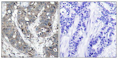 • Immunohistochemical analysis of paraffin-embedded human breast carcinoma tissue using HSP27(Ab-78) Antibody(left) or the same antibody preincubated with blocking peptide(right).